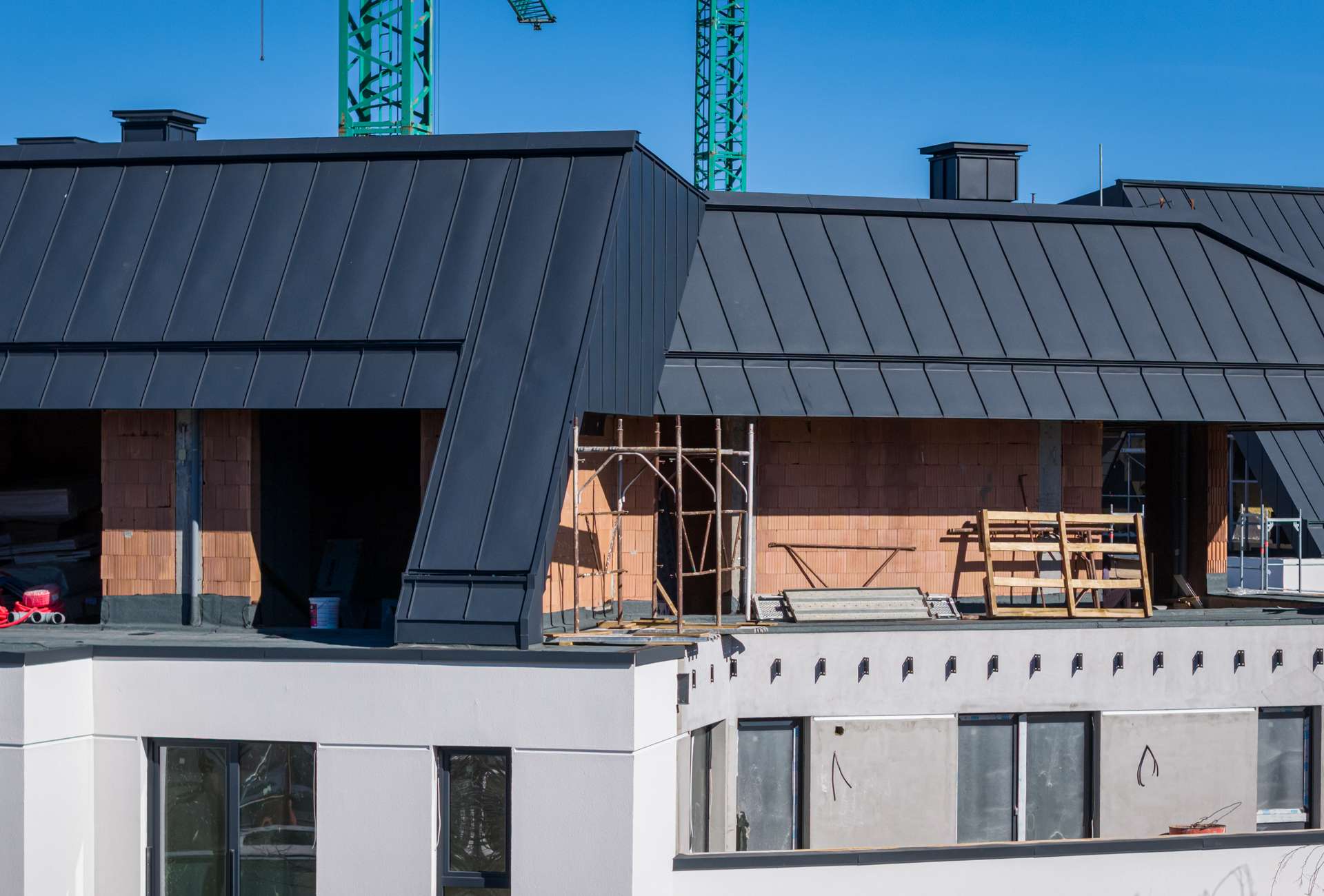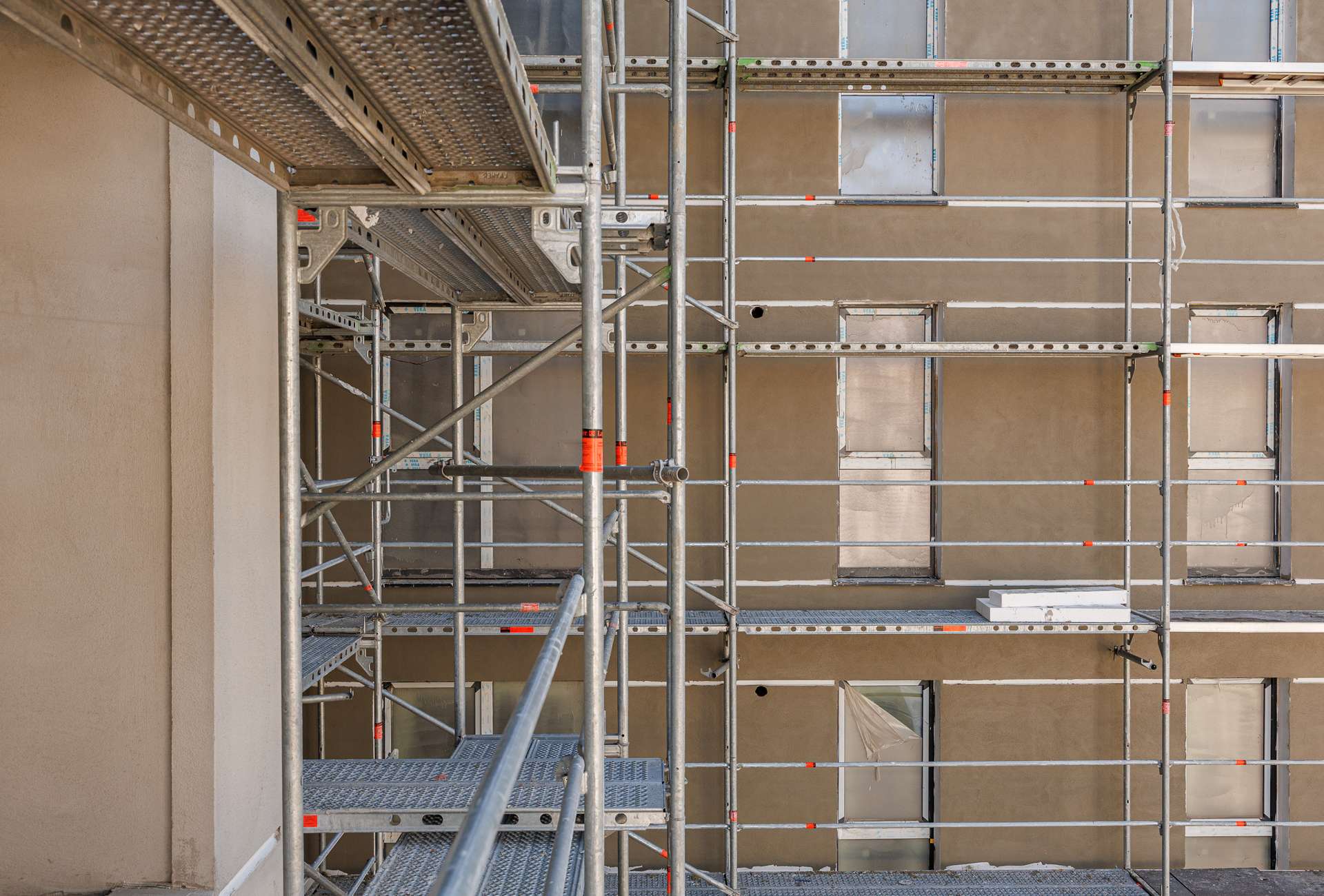Fațadele de pe laturile nord și vest sunt pregătite pentru aplicarea tencuielii decorative la etajele 1–4.