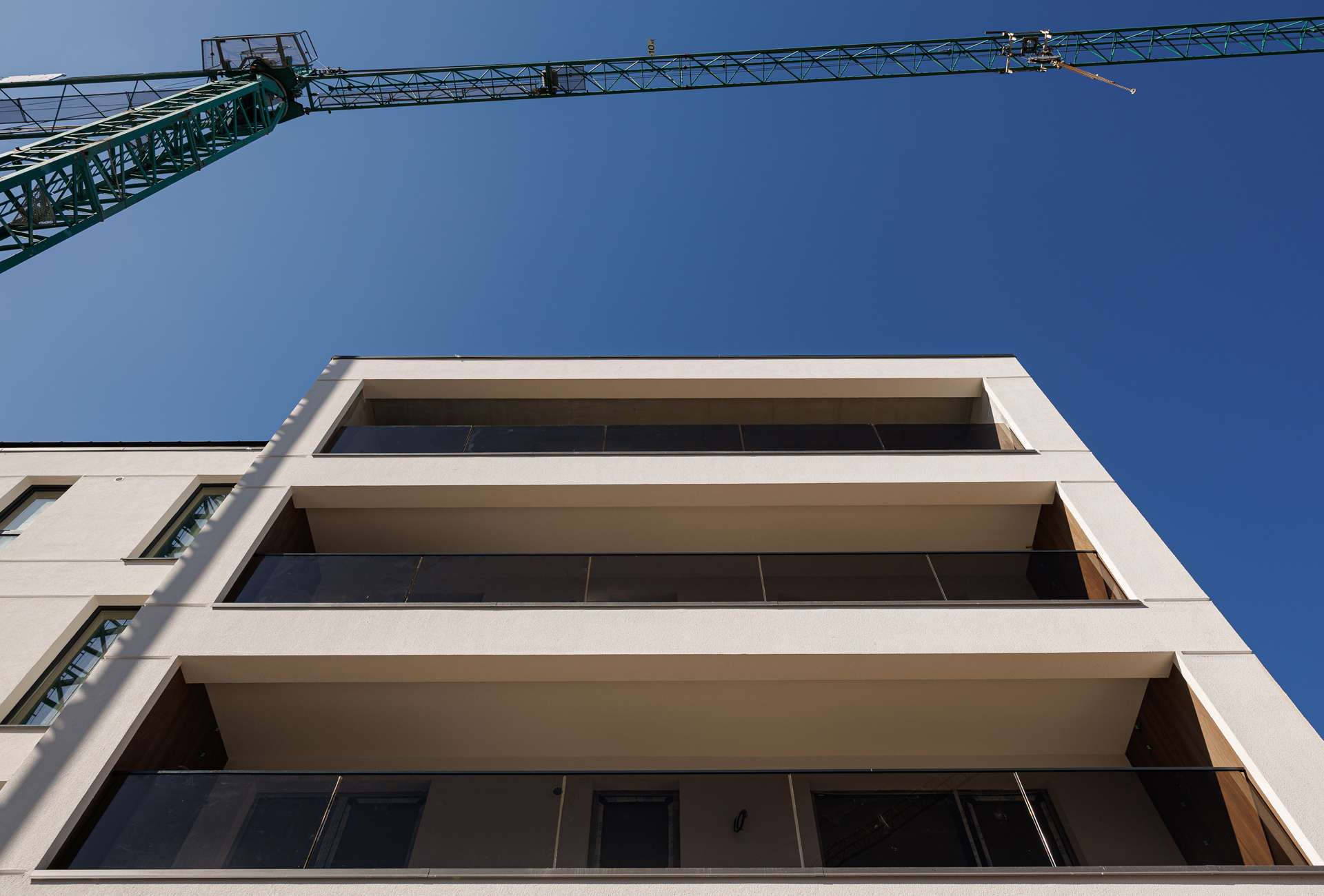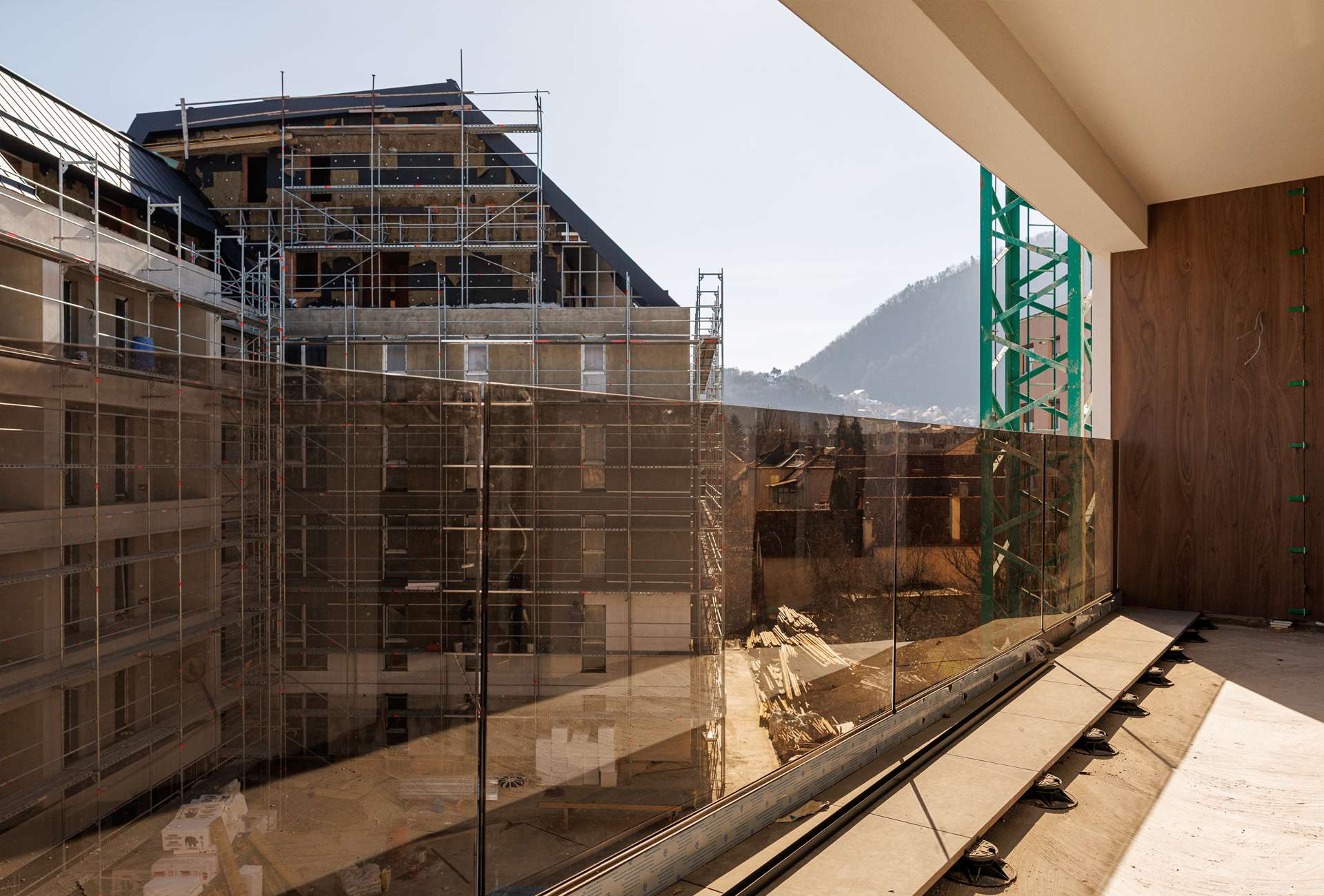 Balustradele din sticlă au fost montate pe fațadă la etajele 1–4.